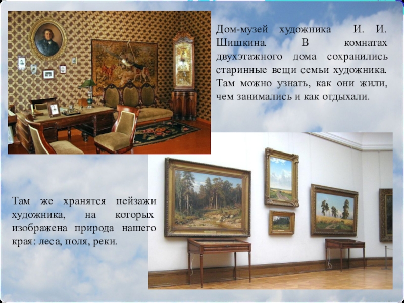 Там же хранятся пейзажи художника, на которых изображена природа нашего края: леса, поля, реки.