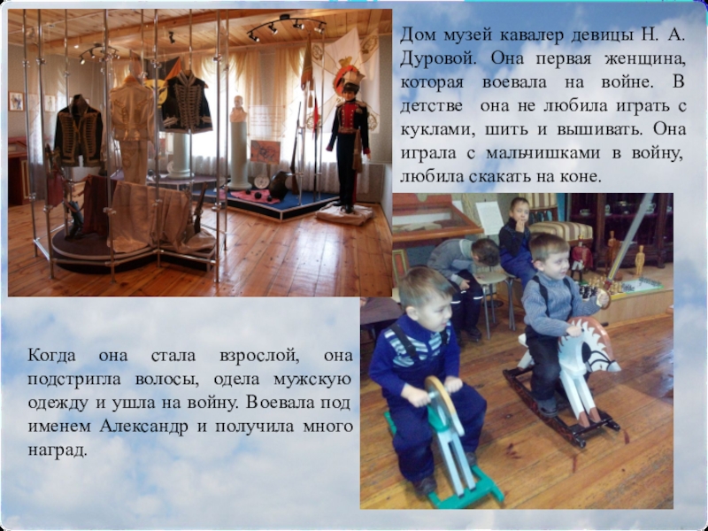 Дом музей кавалер девицы Н. А. Дуровой. Она первая женщина, которая воевала на войне. В детстве она не любила играть с куклами, шить и вышивать. Она играла с мальчишками в войну, любила скакать на коне.