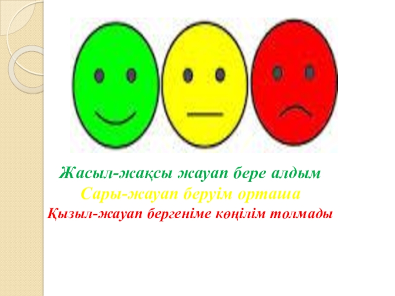 Слайд 7Жасыл-жақсы жауап бере алдым Сары-жауап беруім орташа Қызыл-жауап бергеніме көңілім толмады
