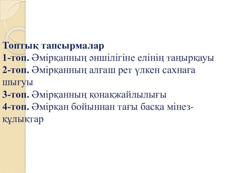 Топтық тапсырмалар1-топ. Әмірқанның әншілігіне елінің таңырқауы2-топ. Әмірқанның алғаш рет үлкен сахнаға шығуы3-топ. Әмірқанның қонақжайлылығы4-топ.