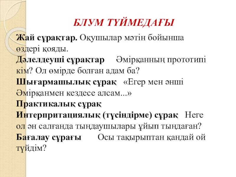 Блум түймедағыЖай сұрақтар. Оқушылар мәтін бойынша өздері қояды.Дәлелдеуші сұрақтар Әмірқанның прототипі кім? Ол өмірде болған адам ба?Шығармашылық сұрақ «Егер мен әнші Әмірқанмен кездесе алсам...»Практикалық сұрақ Интерпритациялық (түсіндірме) сұрақ Неге ол