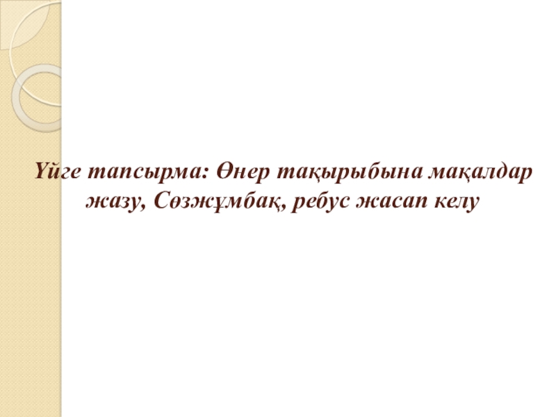 Слайд 8Үйге тапсырма: Өнер тақырыбына мақалдар жазу, Сөзжұмбақ, ребус жасап келу