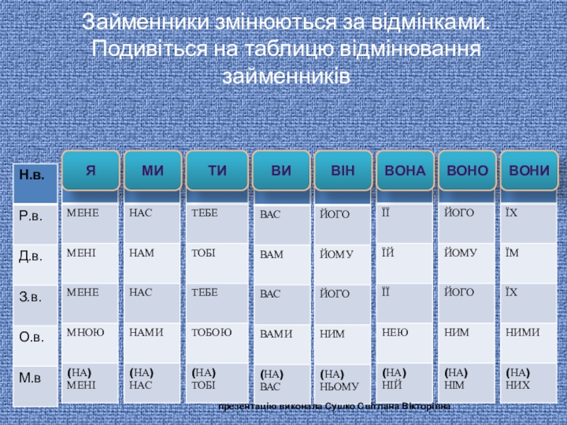 Займенники змінюються за відмінками. Подивіться на таблицю відмінювання займенників  ямитививінвонавоновонипрезентацію виконала Сушко Світлана Вікторівна