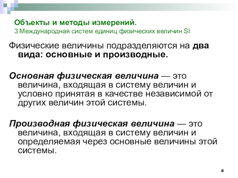 или нескольких основных величин и (или) использовании значений физических констант. Например, определение массы в килограммах, количества вещества — в молях, частоты — в Герцах.