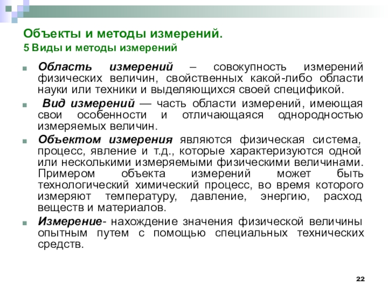 Объектом измерения являются физическая система, процесс, явление и т.д., которые характеризуются одной или несколькими измеряемыми физическими величинами. Примером объекта измерений может быть технологический химический процесс, во время которого измеряют температуру, давление, энергию, расход веществ и материалов.