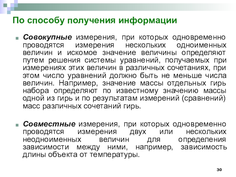 одноименных величин и искомое значение величины определяют путем решения системы уравнений, получаемых при измерениях этих величин в различных сочетаниях, при этом число уравнений должно быть не меньше числа величин. Например, значение массы отдельных гирь набора определяют по известному значению массы одной из гирь и по результатам измерений (сравнений) масс различных сочетаний гирь.