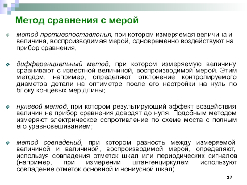 дифференциальный метод, при котором измеряемую величину сравнивают с известной величиной, воспроизводимой мерой. Этим методом, например, определяют отклонение контролируемого диаметра детали на оптиметре после его настройки на нуль по блоку концевых мер длины;