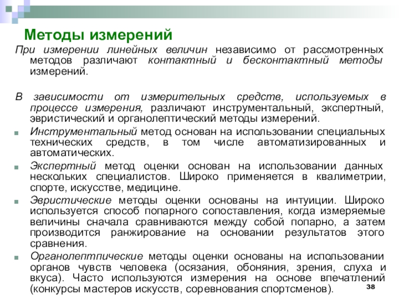 В зависимости от измерительных средств, используемых в процессе измерения, различают инструментальный, экспертный, эвристический и органолептический методы измерений.