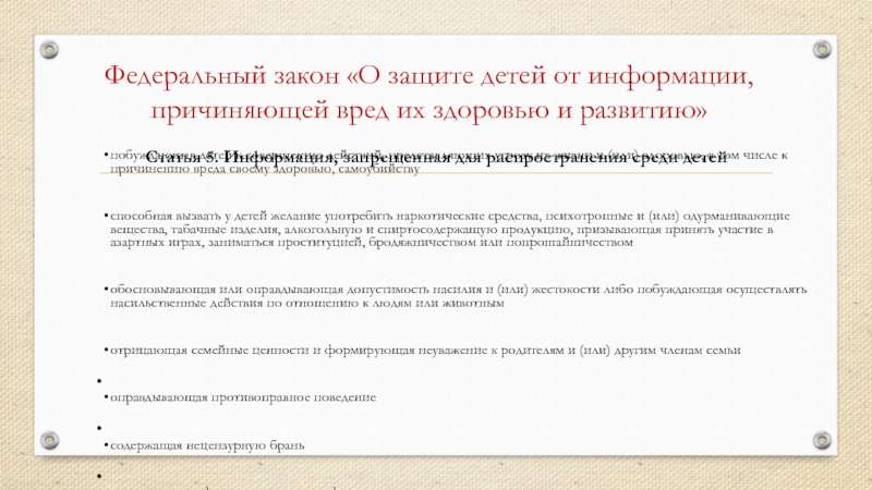 6. Федеральный закон от 29.12.2010 № 436-ФЗ «О защите детей от информации, причиняющей вред их здоровью и развитию».