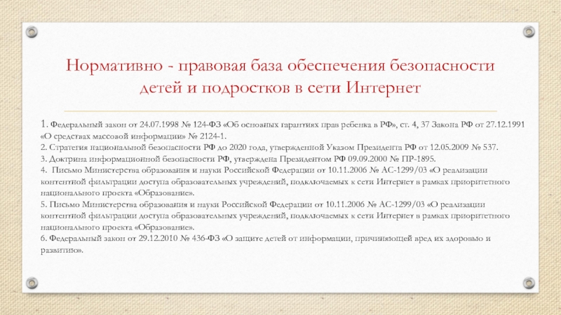 4. Письмо Министерства образования и науки Российской Федерации от 10.11.2006 № АС-1299/03 «О реализации контентной фильтрации доступа образовательных учреждений, подключаемых к сети Интернет в рамках приоритетного национального проекта «Образование».