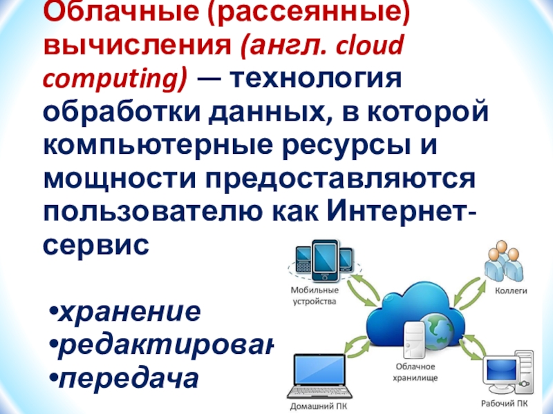 Облачные (рассеянные) вычисления (англ. cloud computing) — технология обработки данных, в которой компьютерные ресурсы и мощности предоставляются пользователю как Интернет-сервисхранениередактированиепередача