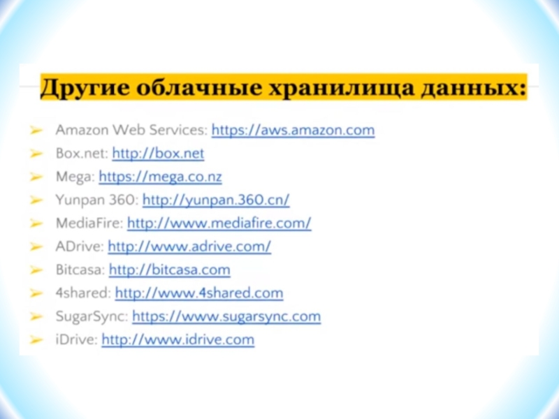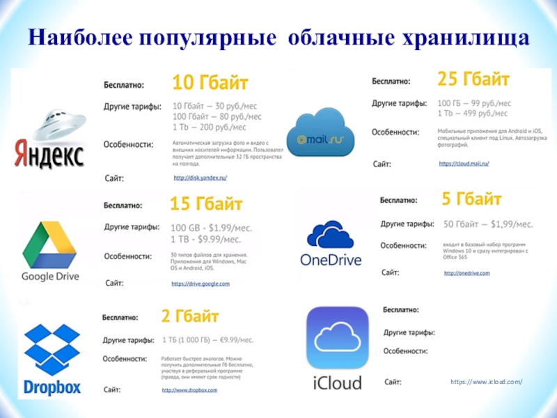 Слайд 4Наиболее популярные облачные хранилища