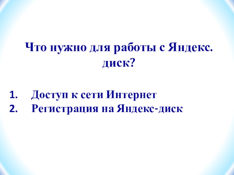 Что нужно для работы с Яндекс.диск?Доступ к сети ИнтернетРегистрация на Яндекс-диск