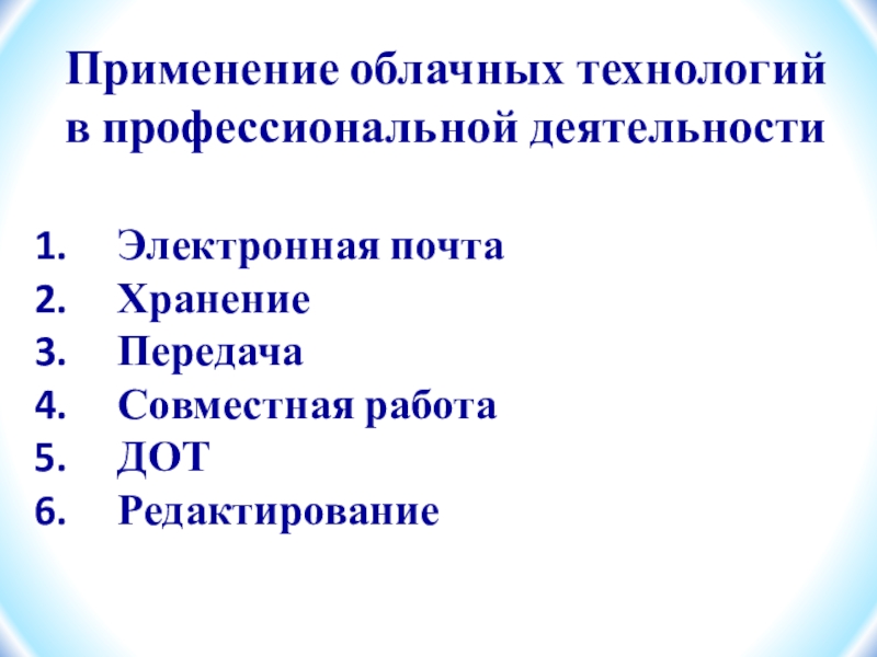 Применение облачных технологий в профессиональной деятельности Электронная почтаХранениеПередачаСовместная работаДОТРедактирование