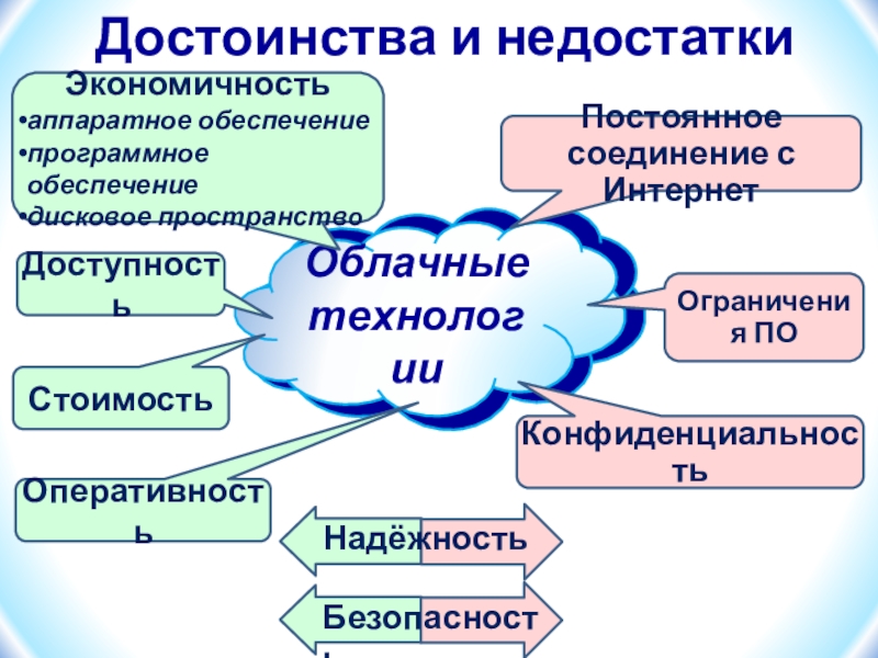 Экономичностьаппаратное обеспечениепрограммное обеспечениедисковое пространствоПостоянное соединение с ИнтернетДоступностьКонфиденциальностьСтоимостьОграничения ПОДостоинства и недостаткиОперативность