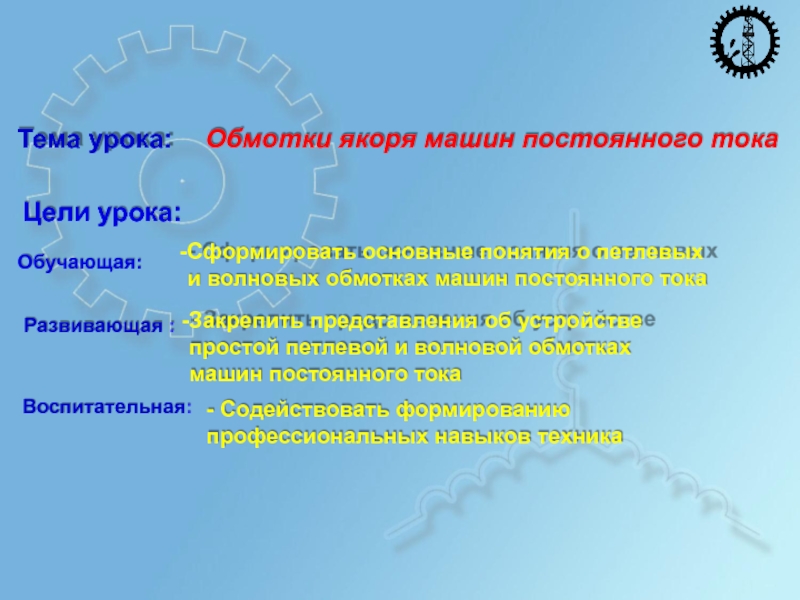 Закрепить представления об устройстве простой петлевой и волновой обмотках машин постоянного тока
