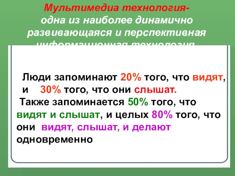 Под мультимедиа технологией понимают совокупность аппаратных и программных средств, которые обеспечивают восприятие человеком информации одновременно несколькими органами чувств.
