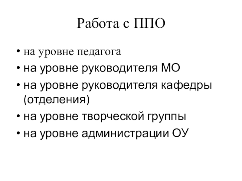 Работа с ППОна уровне педагогана уровне руководителя МОна уровне руководителя кафедры (отделения)на уровне творческой группына уровне администрации
