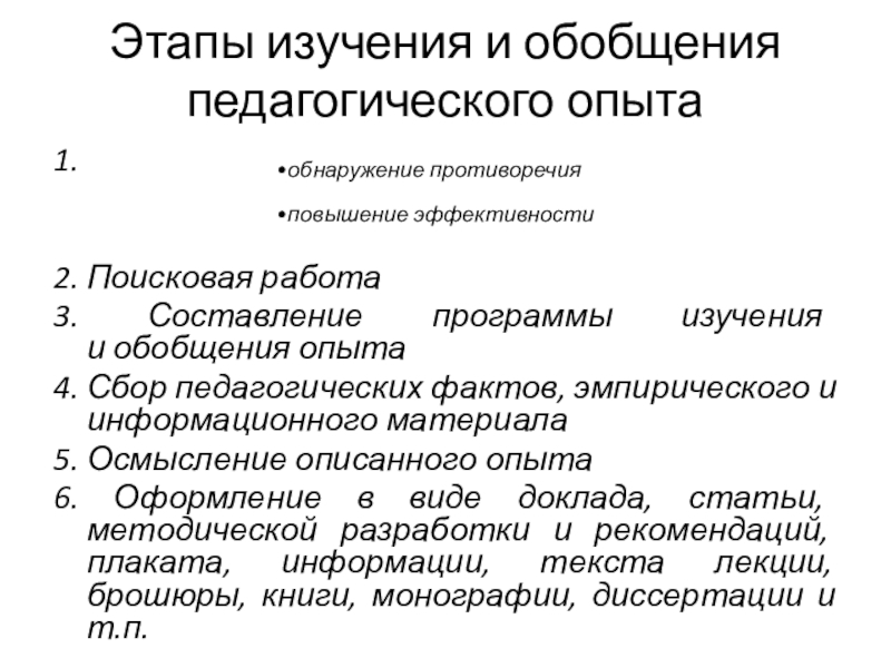 Этапы изучения и обобщения педагогического опыта1.2. Поисковая работа 3. Составление программы изучения и обобщения опыта 4. Сбор педагогических