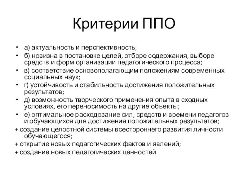 Критерии ППОа) актуальность и перспективность; б) новизна в постановке целей, отборе содержания, выборе средств и форм организации