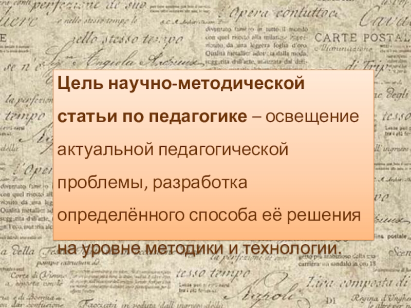 Слайд 6Цель научно-методической статьи по педагогике – освещение актуальной педагогической проблемы, разработка