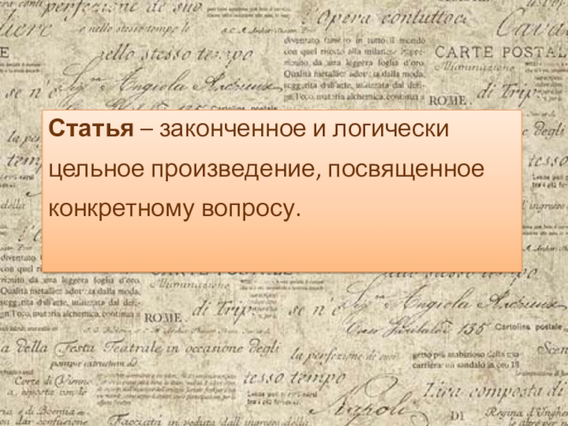 Слайд 5Статья – законченное и логически цельное произведение, посвященное конкретному вопросу.