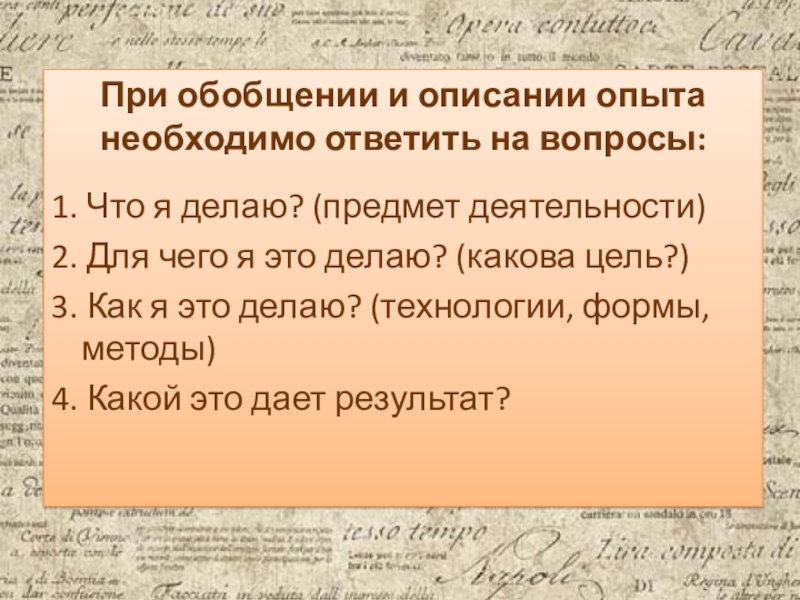 Слайд 4При обобщении и описании опыта необходимо ответить на вопросы: