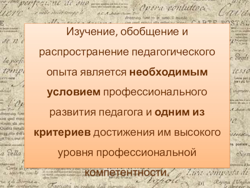 Слайд 2Изучение, обобщение и распространение педагогического опыта является необходимым условием профессионального развития