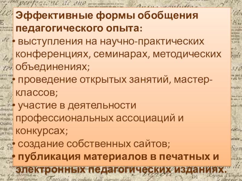 Слайд 3Эффективные формы обобщения педагогического опыта: