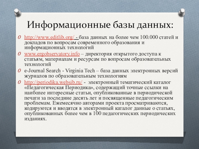 Информационные базы данных:http://www.editlib.org/ - база данных на более чем 100.000 статей и докладов по вопросам современного образования