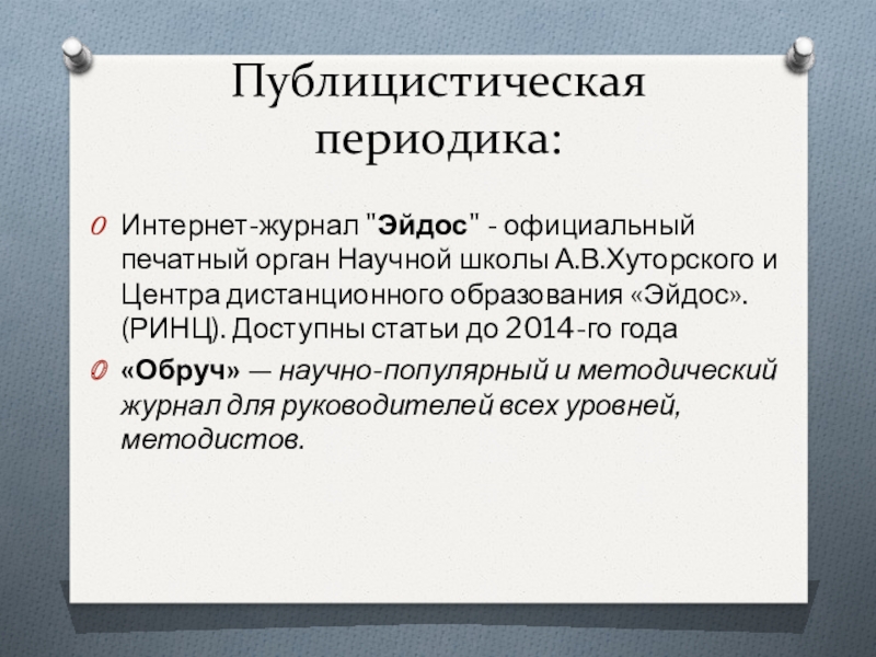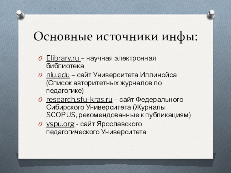 Основные источники инфы:Elibrary.ru – научная электронная библиотекаniu.edu – сайт Университета Иллинойса (Список авторитетных журналов по педагогике)research.sfu-kras.ru –