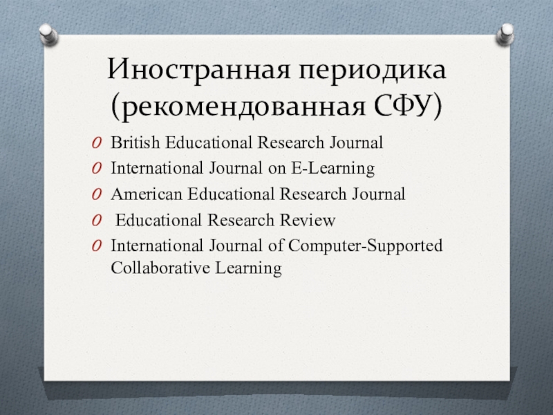 Иностранная периодика (рекомендованная СФУ)British Educational Research Journal International Journal on E-Learning American Educational Research Journal Educational Research
