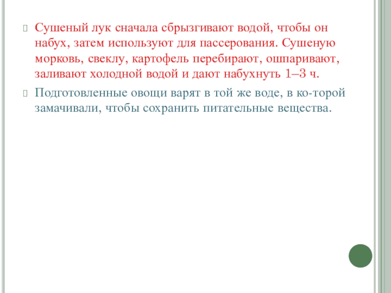 Слайд 6Сушеный лук сначала сбрызгивают водой, чтобы он набух, затем используют для