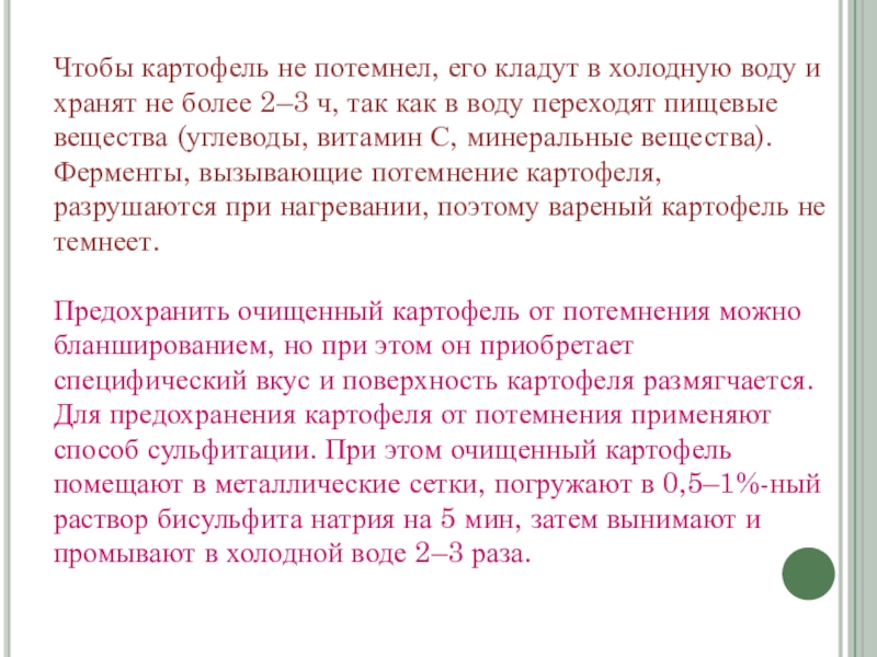 Предохранить очищенный картофель от потемнения можно бланшированием, но при этом он приобретает специфический вкус и поверхность картофеля размягчается. Для предохранения картофеля от потемнения применяют способ сульфитации. При этом очищенный картофель помещают в металлические сетки, погружают в 0,5–1%-ный раствор бисульфита натрия на 5 мин, затем вынимают и промывают в холодной воде 2–3 раза.
