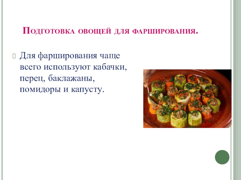 Слайд 9Для фарширования чаще всего используют кабачки, перец, баклажаны, помидоры и капусту.