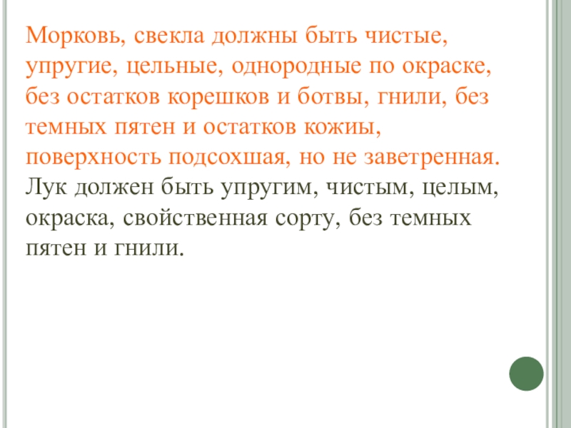 Слайд 18Морковь, свекла должны быть чистые, упругие, цельные, однородные по окраске, без