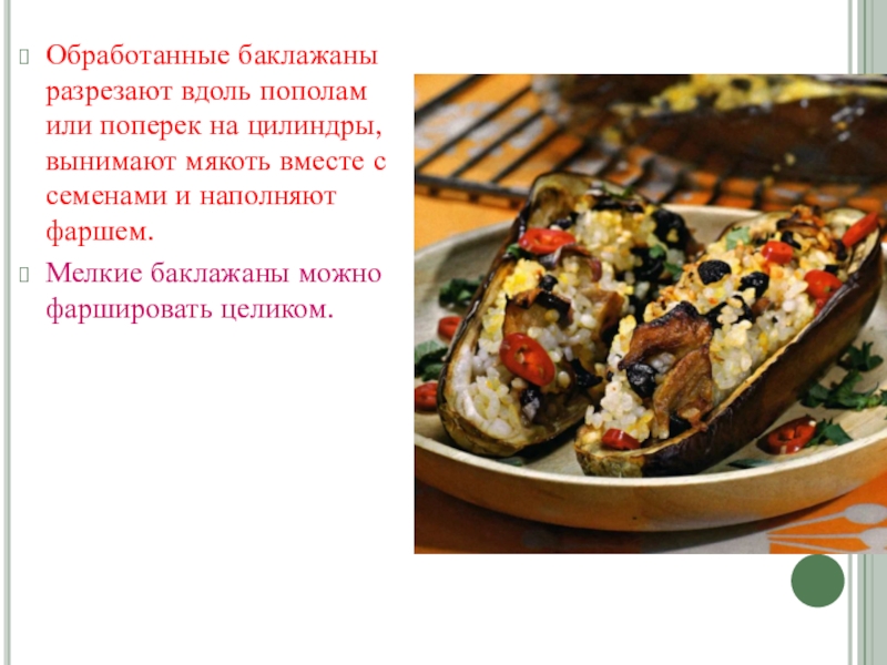 Слайд 14Обработанные баклажаны разрезают вдоль пополам или поперек на цилиндры, вынимают мякоть