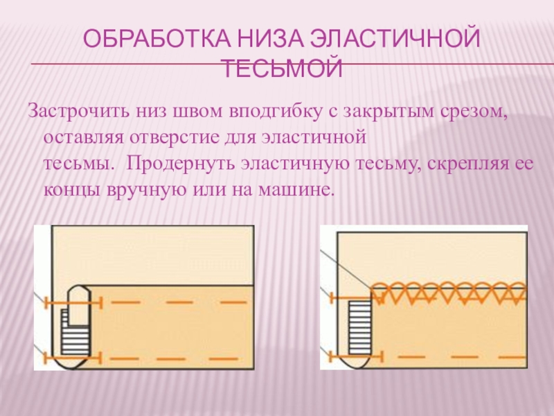 швом вподгибку с закрытым срезом, б) оставить отверстие для продевания резинки, в) продеть эластичную тесьму, закрепляя концы, застрочить оставленное отверстие.)