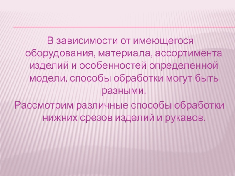 В зависимости от имеющегося оборудования, материала, ассортимента изделий и особенностей определенной модели, способы обработки могут быть разными.Рассмотрим различные способы обработки нижних срезов изделий и рукавов.