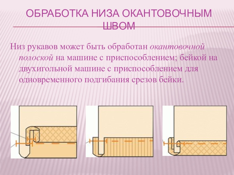 Обработка низа окантовочным швом Низ рукавов может быть обработан окантовочной полоской на машине с приспособлением; бейкой на двухигольной машине