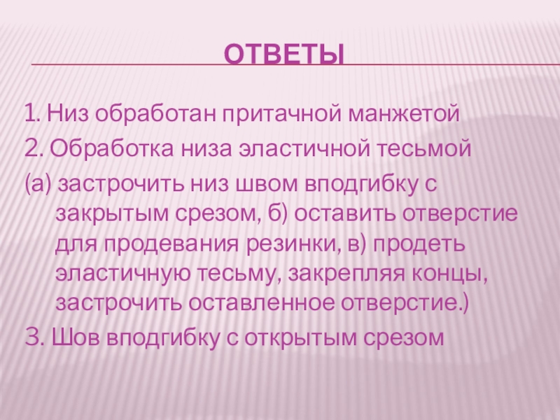 Ответы1. Низ обработан притачной манжетой2. Обработка низа эластичной тесьмой(а) застрочить низ швом вподгибку с закрытым срезом, б)