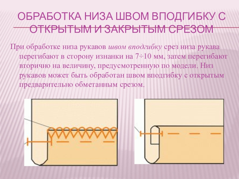 Обработка низа швом вподгибку с открытым и закрытым срезом При обработке низа рукавов швом вподгибку срез низа рукава перегибают