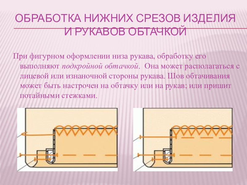 Обработка нижних срезов изделия и рукавов обтачкой  При фигурном оформлении низа рукава, обработку его выполняют подкройной обтачкой.  Она