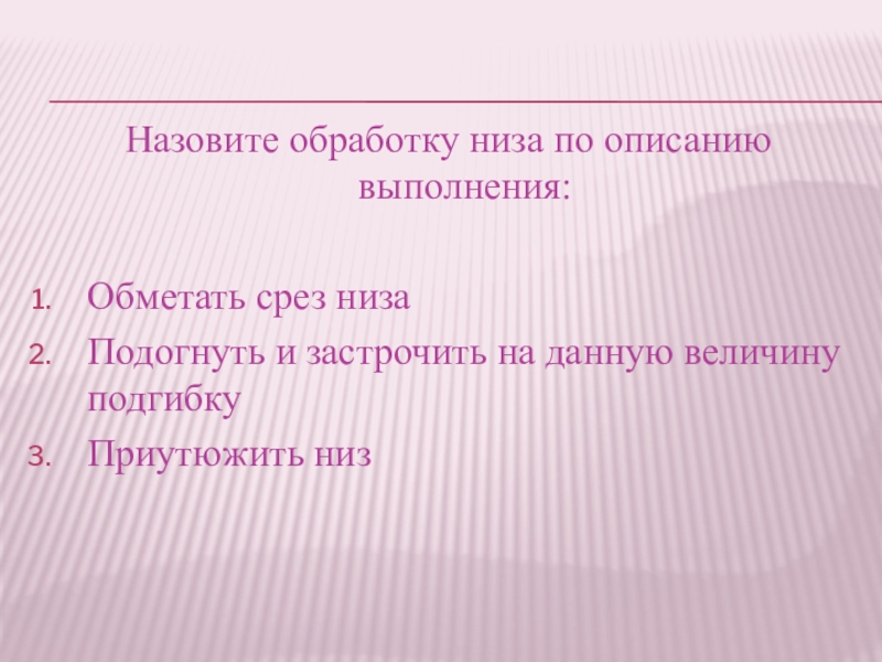 Слайд 10Назовите обработку низа по описанию выполнения:
