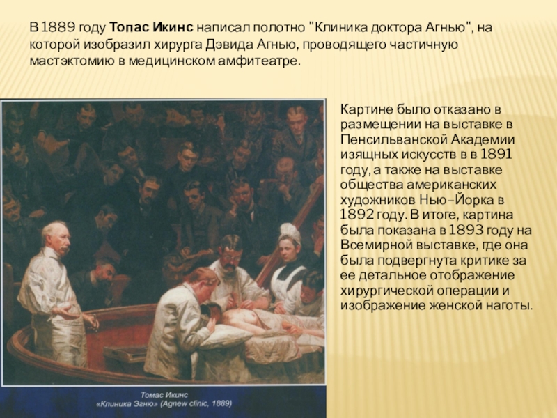 В 1889 году Топас Икинс написал полотно "Клиника доктора Агнью", на которой изобразил хирурга Дэвида Агнью, проводящего частичную мастэктомию в медицинском амфитеатре.