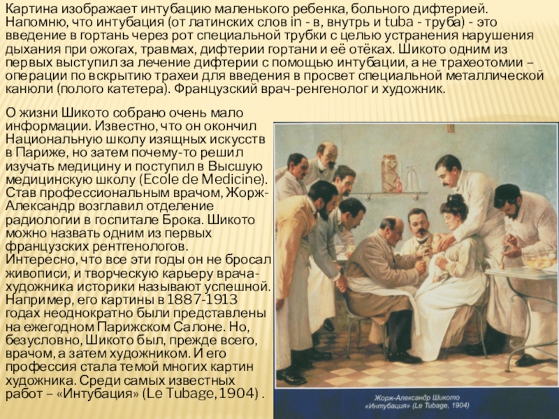 Интересно, что все эти годы он не бросал живописи, и творческую карьеру врача-художника историки называют успешной. Например, его картины в 1887-1913 годах неоднократно были представлены на ежегодном Парижском Салоне. Но, безусловно, Шикото был, прежде всего, врачом, а затем художником. И его профессия стала темой многих картин художника. Среди самых известных работ – «Интубация» (Le Tubage, 1904) .