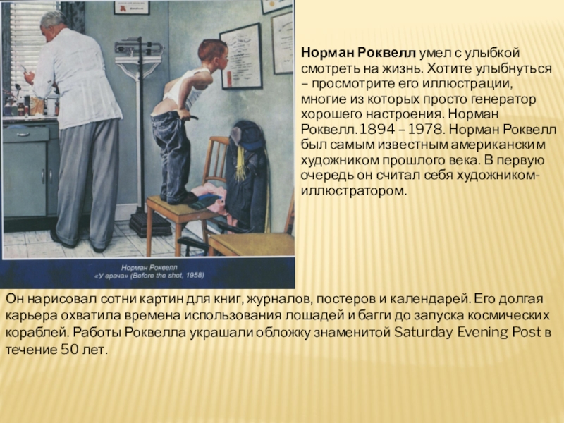 Он нарисовал сотни картин для книг, журналов, постеров и календарей. Его долгая карьера охватила времена использования лошадей и багги до запуска космических кораблей. Работы Роквелла украшали обложку знаменитой Saturday Evening Post в течение 50 лет.