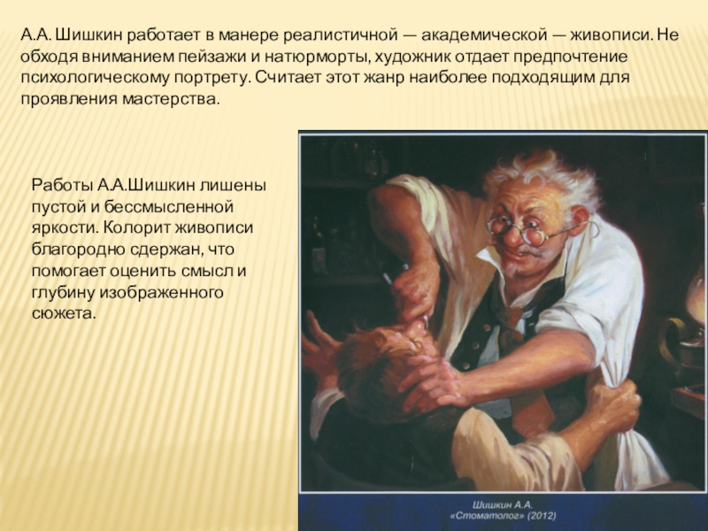 Работы А.А.Шишкин лишены пустой и бессмысленной яркости. Колорит живописи благородно сдержан, что помогает оценить смысл и глубину изображенного сюжета.
