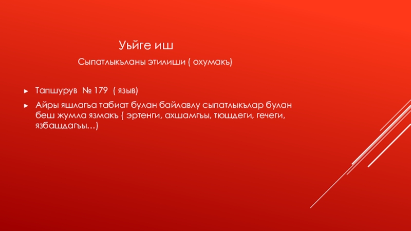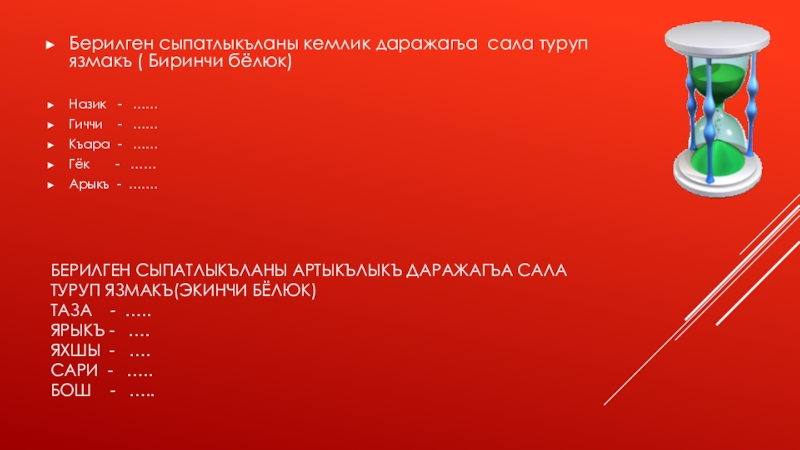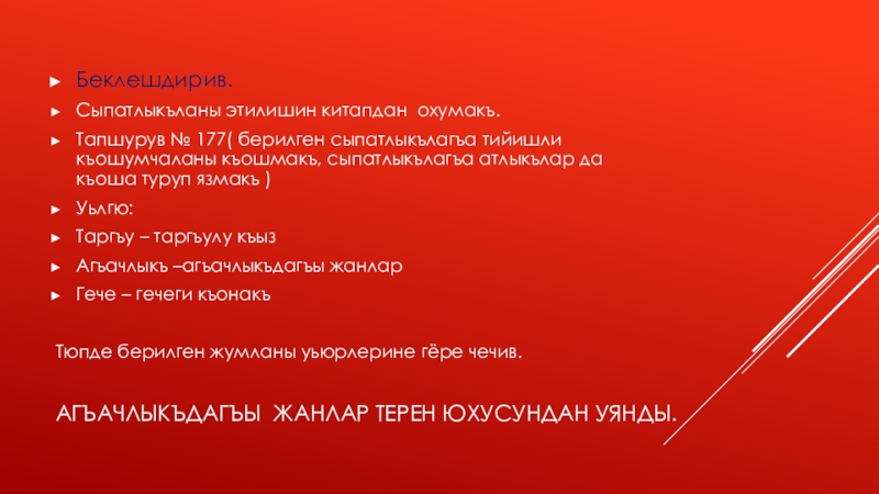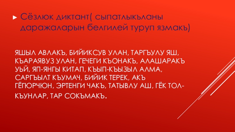 Сёзлюк диктант( сыпатлыкъланы даражаларын белгилей туруп язмакъ)