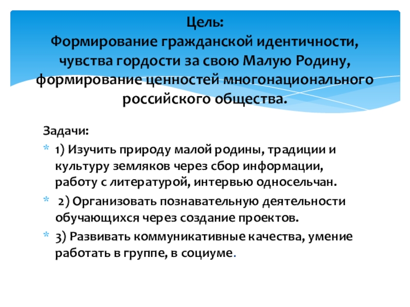 Формирование гражданской идентичности, чувства гордости за свою Малую Родину, формирование ценностей многонационального российского общества.